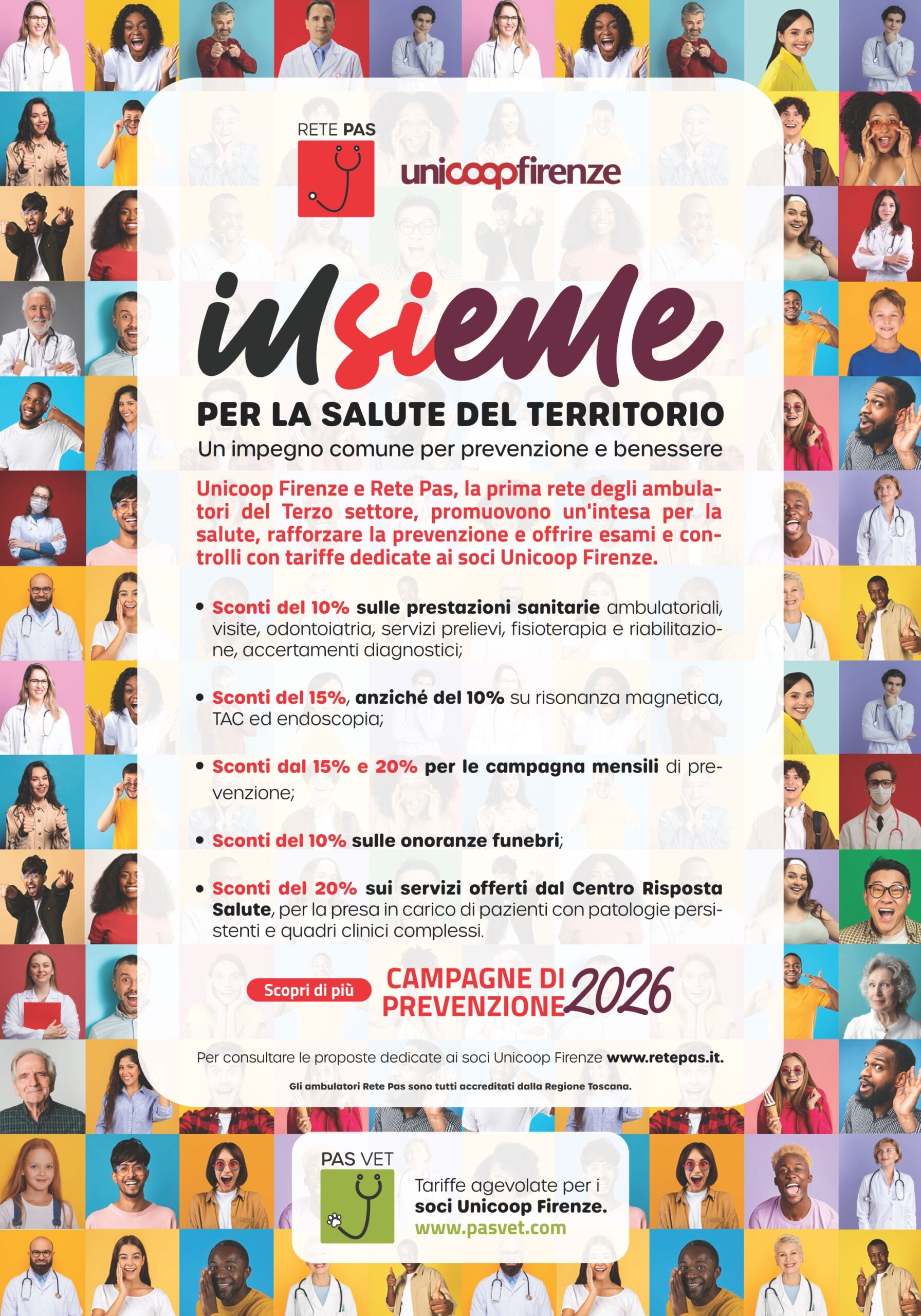 Campagne di prevenzione 2026, Unicoop Firenze e Rete PAS. Gennaio: Esami del Sangue, Uomo/Donna. Febbraio: Tumori del Collo dell'Utero. Marzo: Screening Allergie. Aprile: Disturbi del Sonno. Maggio: Stili di Vita nell'Alimentazione. Giugno: Melanoma. Luglio: Osteoporosi. Settembre: Patologie del Piede. Ottobre: Tumore al Seno. Novembre: Tumore della Prostata. Dicembre: Igiene Dentale. Per informazioni e prenotazioni: PAS CUP 055.71.11.11 oppure Pascup.com